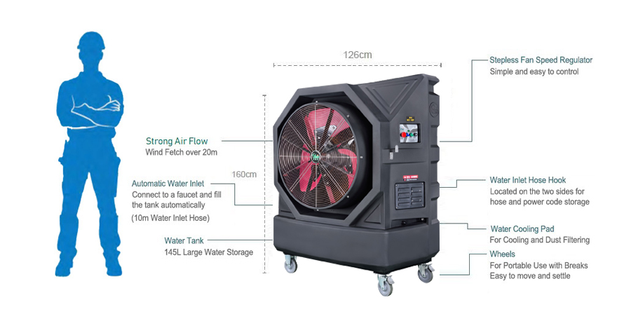 Ya Suh Dar M702-COOL Verdunstungskühler ist ein mobiler, adiabatischer Luftkühler für den gewerblichen Einsatz. Dieses Gerät ist Teil der Ya Suh Dar-Serie und eignet sich besonders für die Kühlung von Innen- und Außenbereichen. Das Plug & Play-Gerät sorgt für angenehme Temperaturen in Fabriken, Industrie- und Produktionsbereichen, Restaurants oder Hotels. Geeignet für Flächen bis 220 m² mit einer Luftumwälzung von 22.000 m³ / Stunde. Ein adiabatischer Kühler kühlt nicht nur die Raumluft, sondern filtert auch Staub und Schmutz.